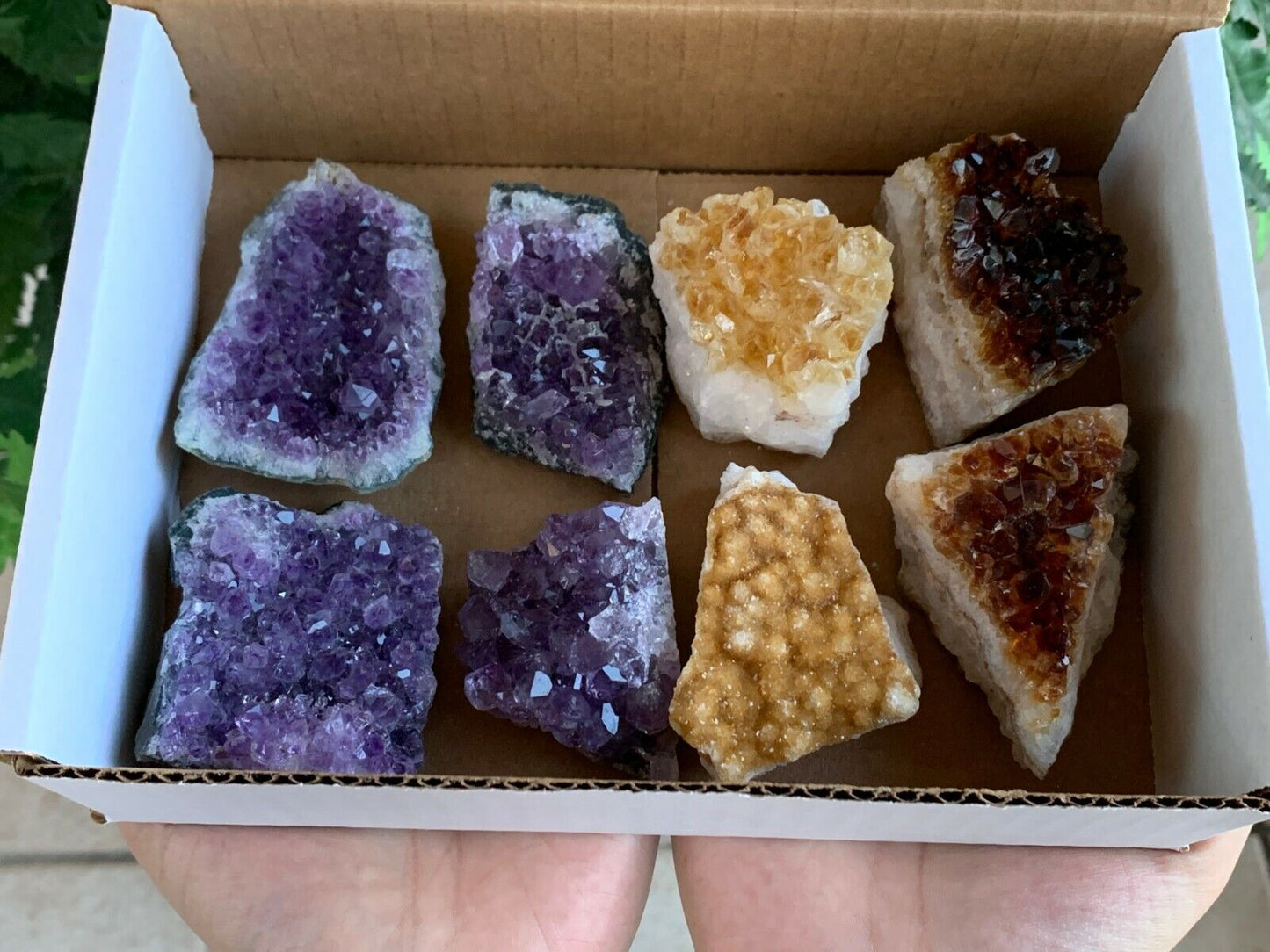 - A mixed flat / gift box set of Grade A+ Stunning Amethyst and Citrine Clusters, Geode, Druzy. Each box has 4 pieces of Amethyst Cluster and 4 pieces of Citrine cluster.