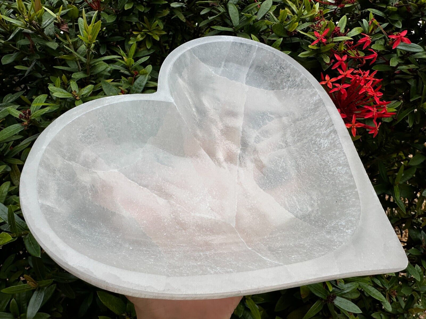 - Clean and smooth surfaces SELENITE heart Shaped Bowl. Very solid dense selenite bowl that can hold a GOOD amount of crystals.