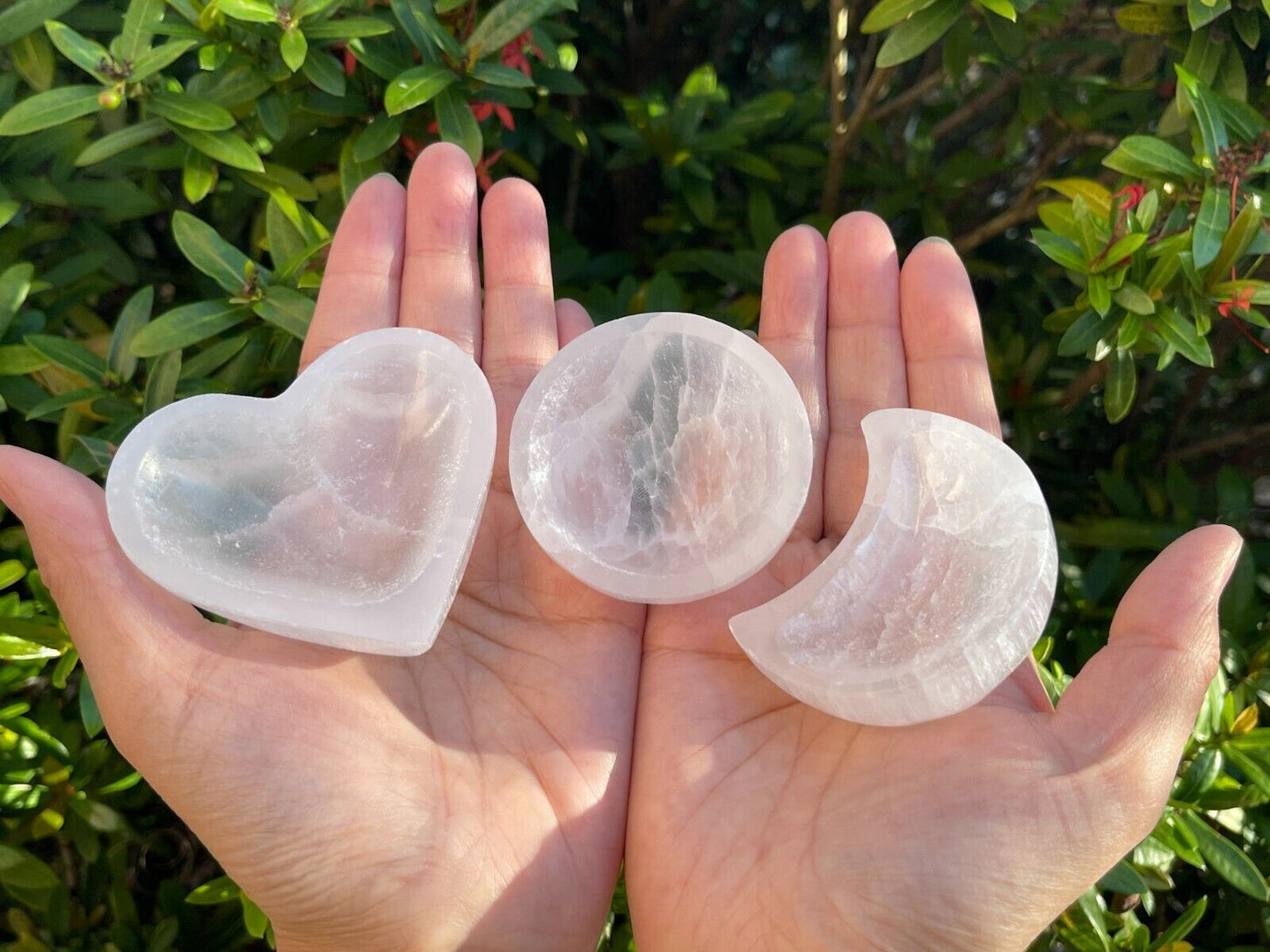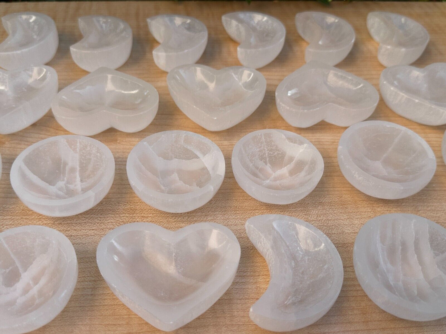 - 100% GENUINE NATURAL SELENITE CRYSTAL, Very Cute Little White Selenite Bowls with shaped of Heart, Round, Moon, Crystal Polished Cleansing Charging Healing Gemstone Bowl.